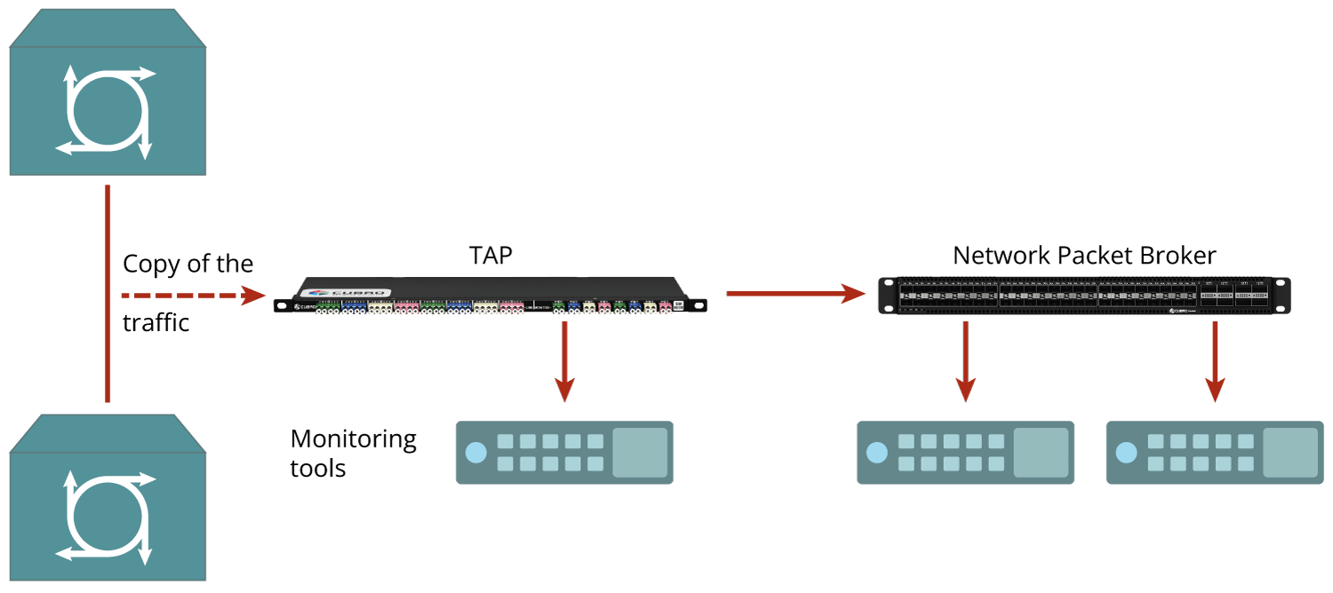TAPs take a copy passively of the network traffic from the links, often between routers or switches. TAP can be directly connected to a monitoring tool, but the biggest benefits can be achieved when the TAP is connected to a Network Packet Broker. Network Packet Broker can aggregate, filter and distribute the packets to several tools at the same time.